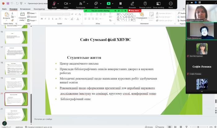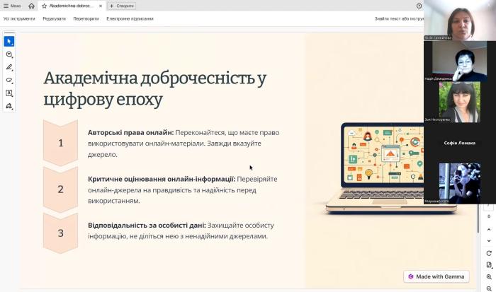 Онлайн-зустріч на тему «Академічна доброчесність – мій свідомий вибір» для учнів Сумської загальноосвітньої школи №5 провела професорка кафедри гуманітарних дисциплін Юлія САМОЙЛОВА. Вона підкреслила, що дотримання норм академічної етики сприяє підвищенню якості знань, розвитку критичного мислення, формуванню особистої відповідальності, а також підготовці до майбутнього професійного зростання.