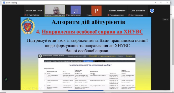 Завідувачка кафедри мовної підготовки ХНУВС Олена СТАТІВКА провела онлайн-зустріч профорієнтаційного спрямування з вихованцями випускних класів загальноосвітніх навчальних закладів Кіровоградської області. Старша викладачка цієї ж кафедри Наталія ОЛЕНДРА зустрілася з учнями 10–11 класів Нетішинського академічного ліцею Нетішинської міської ради Шепетівського району Хмельницької області. Старшокласники переглянули презентацію про науково-навчальні інститути університету. Представниці вишу розповіли учням про умови вступу та навчання, про актуальність професій, перспективи працевлаштування, а також відповіли на запитання й запросили молодь на навчання.