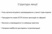 Учасники розглянули ключові аспекти виконання рішень ЄСПЛ органами місцевого самоврядування в Україні, правові механізми імплементації цих рішень, роль місцевих органів у забезпеченні дотримання прав людини, а також виклики, що виникають у процесі виконання судових рішень ЄСПЛ.