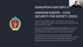 Багато детальної інформації щодо третього кластеру за напрямом «Цивільна безпека для суспільства» надав завідувач науково-дослідної лабораторії соціально-психологічного забезпечення, супроводу та реабілітації працівників МВС навчально-наукового інституту №3 (підготовки фахівців для підрозділів превентивної діяльності Національної поліції України) ХНУВС, виконувач функцій Національного Контактного Пункту (НКП) програми «Горизонт Європа» в Україні за напрямом «Цивільна безпека для суспільства» Олексій СЕРДЮК. Учасники інформаційного заходу дізнались про основні напрями, пріоритети та стратегічні цілі Кластеру 3. Зокрема, «Попередження та реагування на ризики», «Кібербезпека», «Боротьба зі злочинністю та тероризмом», «Захист критичної інфраструктури», «Безпека кордонів», «Підтримка підготовленості суспільства до криз». Спікер також докладно розповів про конкурси в межах кожного з напрямів, зазначив основні та додаткові умови для участі представників українських освітніх, наукових та інших закладів і установ у конкурсах, можливості та перспективи участі у межах програми «Горизонт Європа» для України у конкурсах «Гуманітарне розмінування», «Стійка інфраструктура», «Роботизовані системи».