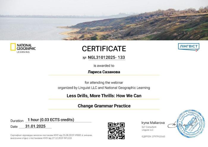 Старша викладачка кафедри мовної підготовки ХНУВС Лариса САЗАНОВА відвідала Міжнародний онлайн-вебінар «Less Drills, More Thrills: How We Can Change Grammar Practice» від Linguist LLC and National Geographic Learning, де ознайомилася з питаннями, пов’язаними з новими методиками, які дозволяють перейти від механічного заучування правил до усвідомленого використання мови, оцінювати граматичні навички в контексті, враховувати різні стилі та потреби здобувачів освіти.