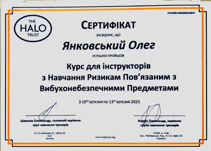 Професор кафедри тактико-спеціальної підготовки ННІ №2 Дмитро ВЛАСЕНКО та викладач цієї ж кафедри Олег ЯНКОВСЬКИЙ пройшли курс «Підготовка інструкторів із навчання ризикам, пов’язаним із вибухонебезпечними предметами» в межах співпраці з The HALO Trust в Україні – міжнародною організацією, сертифікованою у сфері протимінної діяльності та освітніх програм.