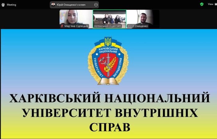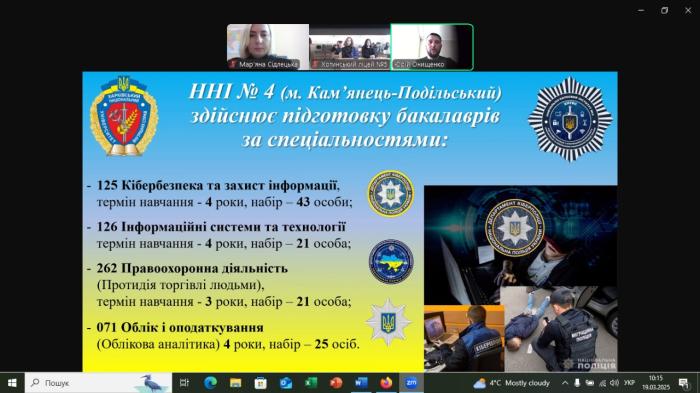 Представники навчально-наукового інституту №4 ХНУВС організували та провели онлайн-зустріч з учнями випускних класів Хотинського ліцею №5 Чернівецької області. Спікерами заходу виступили заступник директора інституту з освітньої та науково-дослідної діяльності Юрій ОНИЩЕНКО та заступниця начальника курсу Мар’яна СІДЛЕЦЬКА.