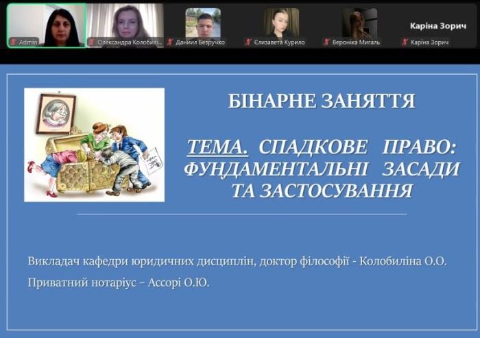 Студенти 2 курсу спеціальності «Право» Сумської філії ХНУВС взяли участь у бінарному занятті на тему «Спадкове право: фундаментальні засади та застосування». Заняття провели викладачка кафедри юридичних дисциплін Олександра КОЛОБИЛІНА та запрошена експертка – приватний нотаріус Оксана АССОРІ.