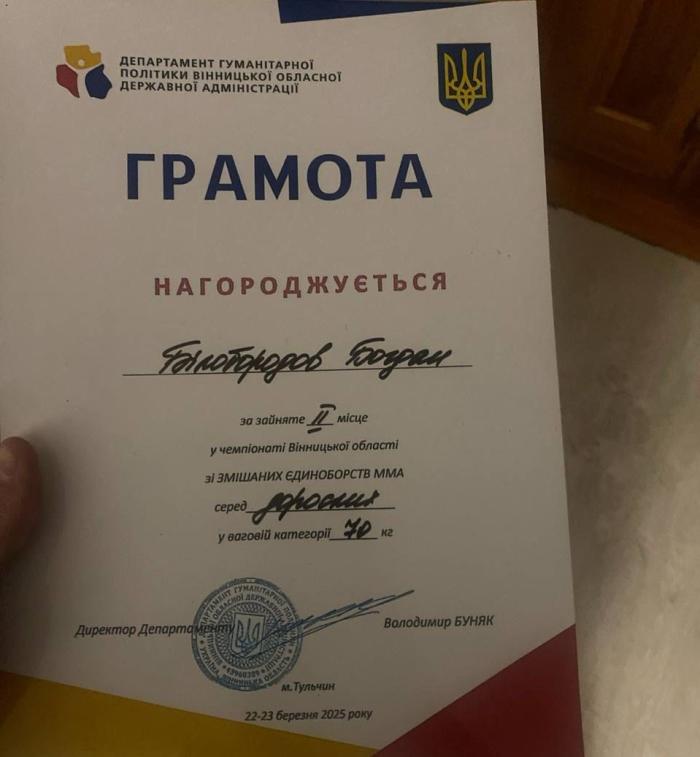 Нещодавно в місті Тульчин Вінницької області відбувся обласний чемпіонат зі змішаних єдиноборств ММА, де зібралися найкращі спортсмени регіону. У змаганнях взяли участь здобувачі освіти Харківського національного університету внутрішніх справ. Курсант 2 курсу ННІ №2 Богдан БІЛОБОРОДОВ продемонстрував високу технічну підготовку і здобув срібну медаль у ваговій категорії до 70 кг, поступившись лише у фіналі.