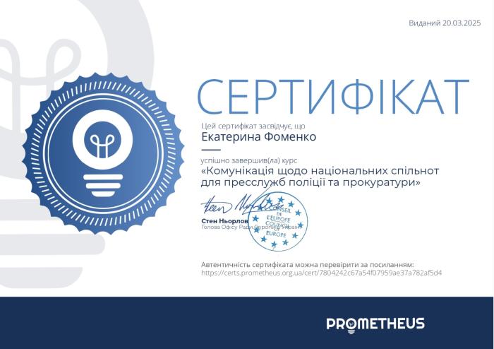 Начальник відділу аспірантури (ад’юнктури) і докторантури, професор кафедри адміністративної діяльності, кандидат юридичних наук, доцент Володимир ІВАНЦОВ разом із курсантами ННІ №2 успішно завершили онлайн-курс «Комунікація щодо національних спільнот для пресслужб поліції та прокуратури», що проводився на платформі Prometheus.