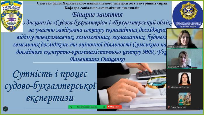 Доцентка кафедри соціально-економічних дисциплін Сумської філії ХНУВС Людмила ПАРФЕНТІЙ у межах вивчення дисциплін «Судова бухгалтерія» та «Бухгалтерський облік» організувала онлайн-заняття для студентів 2-3 курсів, які навчаються за спеціальностями 262 «Правоохоронна діяльність» і 081 «Право». У його проведенні взяла участь завідувачка сектору економічних досліджень відділу товарознавчих, гемологічних, економічних, будівельних, земельних досліджень та оціночної діяльності Сумського науково-дослідного експертно-криміналістичного центру МВС України Валентина ОНІЩЕНКО.