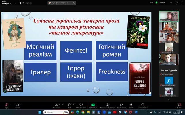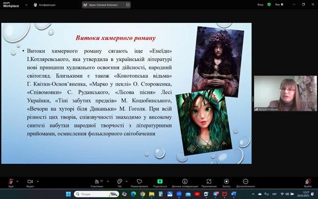 На запрошення кафедри історії української літератури Харківського національного університету імені В. Н. Каразіна доцентка кафедри гуманітарних дисциплін та українознавства, кандидатка філологічних наук Наталія КОБИЛКО прочитала лекцію для студентів-філологів 4 курсу. Викладачка розповіла про передумови появи нового виду роману в українській літературі 70-80-х рр. ХХ ст., його основні риси, дискусію критиків щодо жанрової дефініції художніх творів. Митці химерної прози активно зверталися до міфології, використовували український фольклор, що сприяло збереженню національної культури. Під час лекції було розглянуто романи й повісті О. Ільченка, В. Земляка, В. Шевчука, В. Міняйла, В. Дрозда, В. Яворівського, П. Загребельного, виокремлено характерні ознаки, які дають можливість зараховувати їх до химерного прозописьма. Окрему увагу Наталія КОБИЛКО звернула на відродження цього явища в сучасній літературі в таких жанрах, як фентезі, хорор, трилер, магічний реалізм, неоготика.