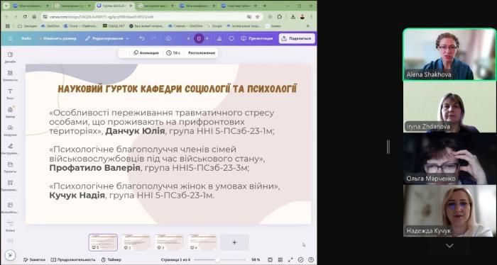Члени гуртка підготували доповіді: Юлія ДАНЧУК на тему «Особливості переживання травматичного стресу особами, що проживають на прифронтових територіях», Валерій ПРОФАТИЛО – «Психологічне благополуччя членів сімей військовослужбовців пiд час воєнного стану», Надія КУЧУК – «Психологічним благополуччям жінок в умовах війни».
