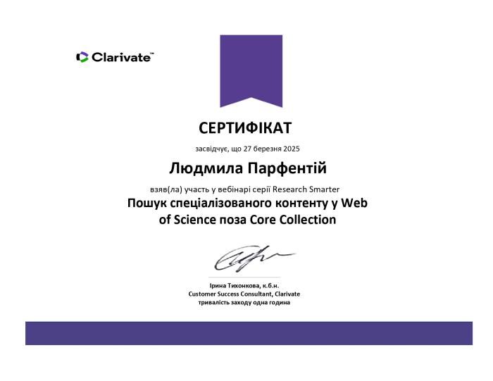 Вебінари провела консультантка з успіху клієнтів компанії Clarivate, PhD Ірина ТИХОНКОВА. Учасники ознайомилися з основами наукометрії, джерелами та даними, що використовуються в дослідженнях, а також із ключовими метриками та методами їх розрахунку. Окрім цього, слухачі дізналися про пошук додаткового контенту в Web of Science, розширені пошукові можливості для різних типів документів (дисертацій, патентів, дослідницьких даних, грантів тощо) та аналіз спеціалізованих баз даних.