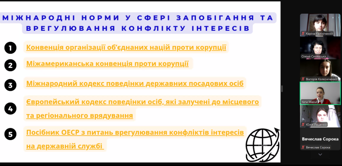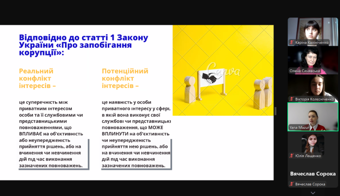 Здобувачі освіти закріпили знання щодо поняття та видів конфлікту інтересів, системи заходів його врегулювання та обов’язків, пов’язаних із реалізацією цих заходів. Також вони з’ясували окремі види обмежень, пов’язаних із конфліктом інтересів, зокрема щодо одержання подарунків, сумісництва та суміщення з іншими видами діяльності, спільної роботи близьких осіб, а також обмежень після припинення діяльності, пов’язаної з виконанням функцій держави або місцевого самоврядування. Крім того, були розглянуті конкретні кейси за тематикою семінарського заняття.