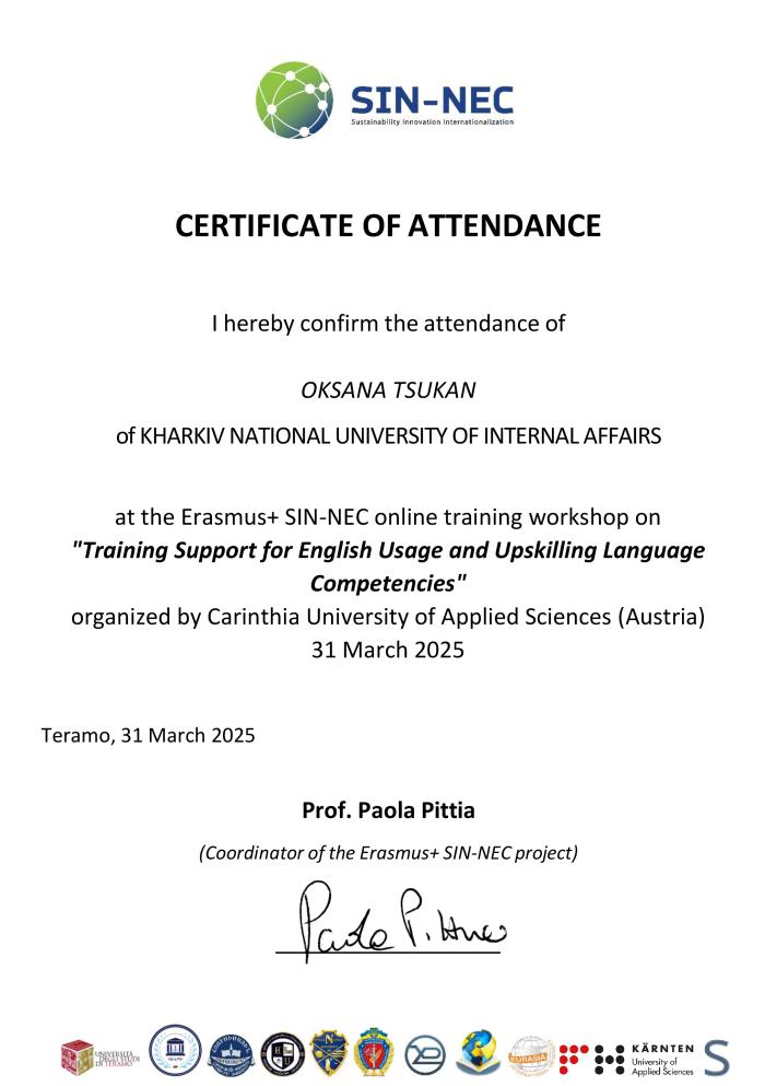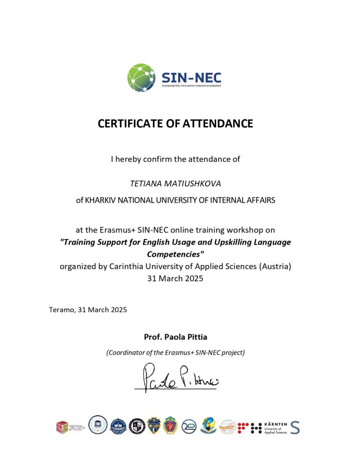 Помічниця ректора з гендерних питань Оксана ЦУКАН, начальниця відділу міжнародного співробітництва Тетяна МАТЮШКОВА та завідувачка кафедри мовної підготовки Олена СТАТІВКА пройшли онлайн-тренінг проєкту «Сталість та спроможність інтернаціоналізації з метою модернізації вищої освіти для дебютантів із країн Східного партнерства» (SIN-NEC) Програми Еразмус+ за напрямом К2, учасником якої є ХНУВС.
