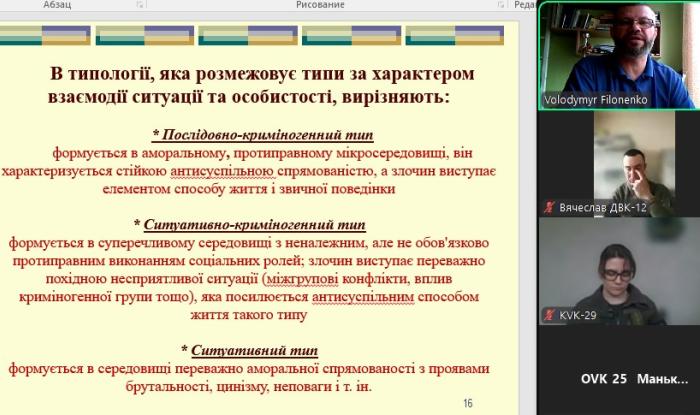 Доцент кафедри соціології та психології ННІ №5 Володимир ФІЛОНЕНКО провів навчально-практичний онлайн-семінар для фахівців державної пенітенціарної служби України Харківської, Полтавської та Сумської областей в межах підвищення ефективності професійної діяльності психологів і персоналу соціально-психологічної служби установ виконання покарань і слідчих ізоляторів.
