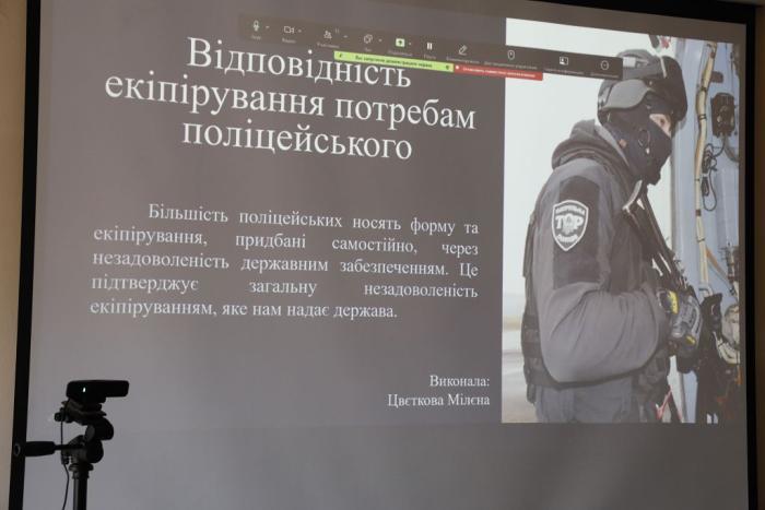 Курсантка 2 курсу ННІ №2 Мілєна ЦВЄТКОВА представила результати свого дослідження, присвяченого аналізу відповідності екіпірування потребам поліцейських. Вона акцентувала увагу на його впливі на особисту безпеку, швидкість реакції та ефективність виконання завдань. Під час виступу курсантка наочно продемонструвала зразки якісного та неякісного екіпірування.