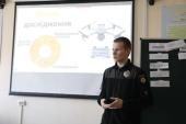 До зустрічі також доєднався випускник університету Ярослав СЛАТІН, який зараз проходить службу в бойових підрозділах поліції неподалік лінії зіткнення на сході України. Він поділився власним досвідом та окреслив найбільш актуальні виклики, що постають перед поліцейськими під час виконання службово-бойових завдань.