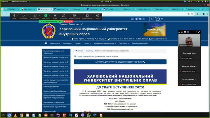 У заході взяли участь представники закладів загальної середньої освіти Харківської області, які отримали унікальну можливість ознайомитися з освітніми програмами та кар'єрними перспективами в сфері кібербезпеки. Спікером заходу виступив завідувач науково-дослідної лабораторії з проблем інформаційних технологій та протидії злочинності у кіберпросторі ННІ №4 Дмитро ПАШНЄВ. Він розповів про актуальні загрози у цифровому середовищі, перспективи розвитку кібербезпеки та можливості навчання у ХНУВС для тих, хто прагне здобути освіту в цій галузі. Учасники зустрічі отримали вичерпні відповіді на запитання щодо вступу, особливостей навчання та подальшого працевлаштування. Представник університету також висвітлив практичні аспекти роботи в сфері інформаційної безпеки, окреслив необхідні навички та вимоги до фахівців, які планують будувати кар'єру в цій галузі.