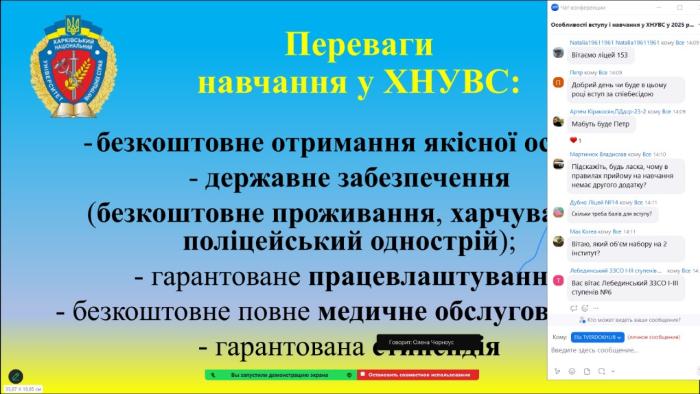 Презентацію університету провела начальниця відділу профорієнтації Олена ЧОРНОУС, яка розповіла про умови вступу, навчально-наукові інститути та спеціальності, а також переваги навчання у ХНУВС.