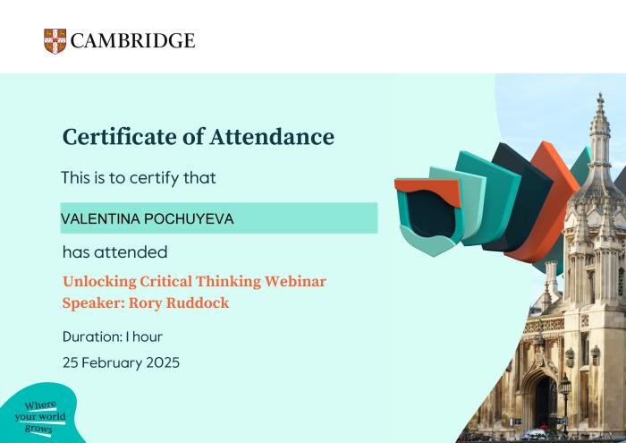 Науково-педагогічний склад кафедри мовної підготовки ХНУВС – завідувачка кафедри Олена СТАТІВКА, професор Олег ГОНЧАРУК, доцентки Валентина ПОЧУЄВА та Валентина КОЧИНА, старші викладачі Лариса САЗАНОВА та Артем БІЛОУСОВ – взяли участь у Міжнародному онлайн-вебінарі «Unlocking Critical Thinking» від Cambridge.