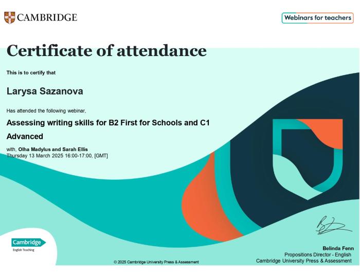 Науково-педагогічний склад кафедри мовної підготовки ХНУВС – завідувачка кафедри Олена СТАТІВКА, професор Олег ГОНЧАРУК, доцентки Валентина ПОЧУЄВА та Валентина КОЧИНА, старші викладачі Лариса САЗАНОВА та Артем БІЛОУСОВ – відвідали міжнародний онлайн-вебінар «Assessing writing skills for B2 First for Schools and C1 Advance» від Cambridge University Press & Assessment. Під час навчання вони ознайомилися із завданнями тестів і практичним застосуванням критеріїв оцінювання, ідеями та ресурсами для підвищення впевненості в оцінюванні письмових робіт, а також із способами надання конструктивного зворотного зв’язку.