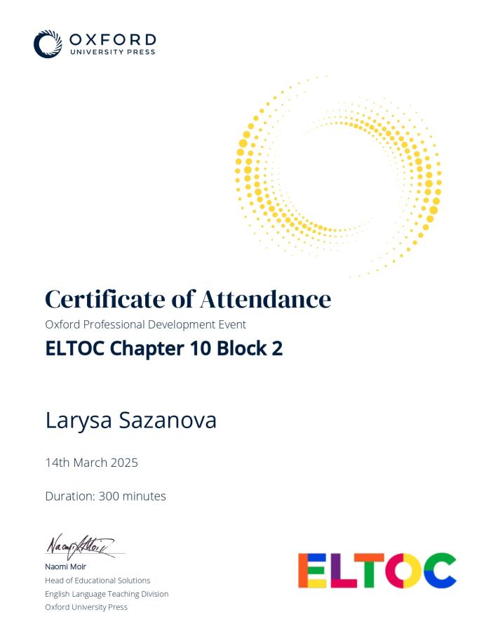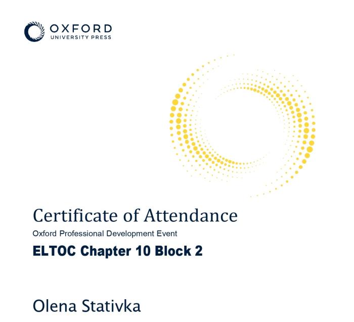 Науково-педагогічний склад кафедри мовної підготовки ХНУВС – завідувачка кафедри Олена СТАТІВКА, професор Олег ГОНЧАРУК, доцентки Валентина ПОЧУЄВА та Валентина КОЧИНА, старші викладачі Лариса САЗАНОВА та Артем БІЛОУСОВ – відвідали триденний Міжнародний онлайн-вебінар професійного розвиту «ELTOC Chapter 10 Block 2» від Oxford University Press. Викладачі взяли участь у трьох сесіях: «Helping students develop confidence in the skill of speaking», «Encouraging positive washback in exam preparation», «Wellbeing in the young learner classroom».