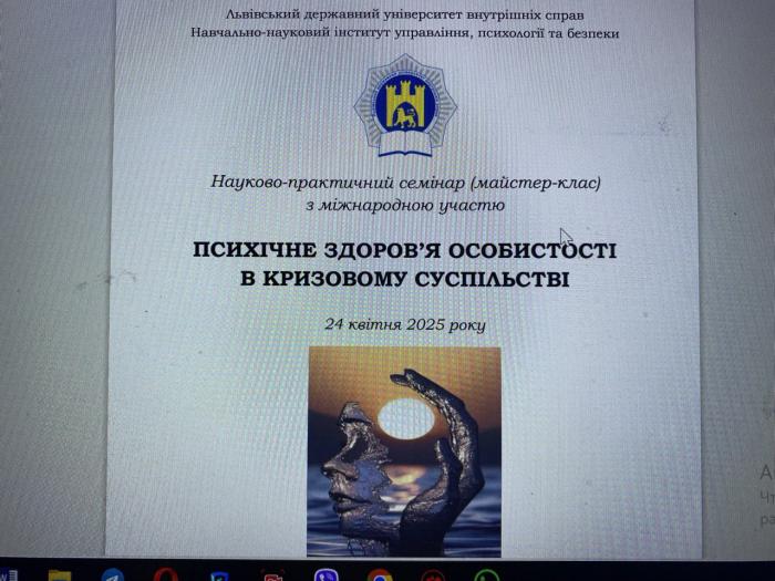 Здобувачі вищої освіти 3 курсу ННІ №3, які навчаються за спеціальністю «Психологія», дистанційно долучилися до роботи науково-практичного семінару (майстер-класу) з міжнародною участю «Психічне здоров’я особистості у кризовому суспільстві», що проходив у Львівському державному університеті внутрішніх справ.