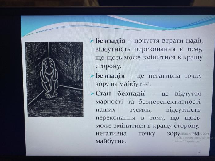 Професорка кафедри психології, соціології та педагогіки ННІ №3, докторка психологічних наук Наталя МІЛОРАДОВА провела майстер-клас на тему «Особливості надання психологічної допомоги у стані безнадії». Його мета – актуалізація особливостей використання різноманітних психотехнік для побудови шляхів виходу зі стану безнадії через переосмислення сенсу буття та усвідомлення особистої цінності.