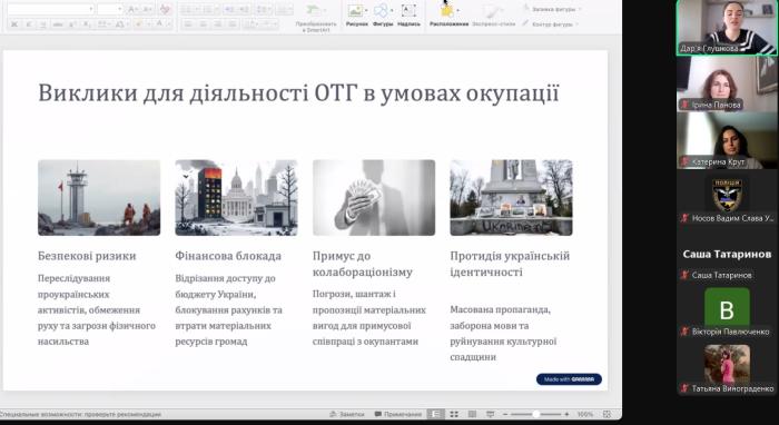 Дарʼя ГЛУШКОВА наголосила, що тема діяльності ОТГ в умовах окупації – це не лише правова, а й глибоко гуманітарна проблема: «Коли громада втрачає доступ до українських інституцій, починає діяти внутрішній резерв – ініціативні мешканці, волонтери, місцеві лідери. Вони тримають на собі все: від освіти до гуманітарної допомоги».