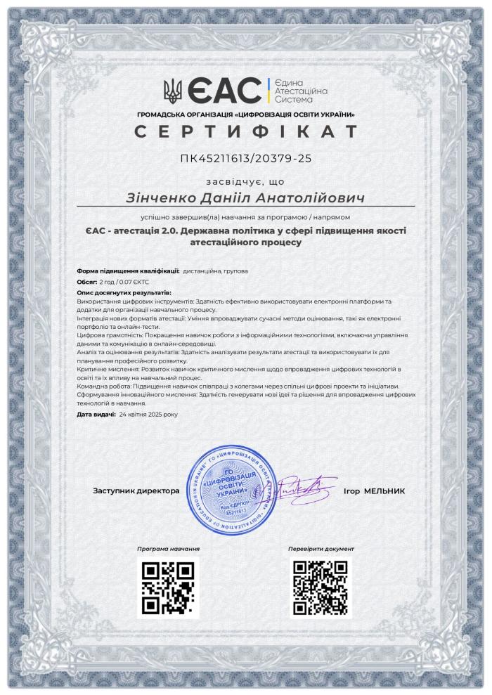 Ад'юнкт відділу аспірантури (ад'юнктури) і докторантури Данііл ЗІНЧЕНКО успішно пройшов атестаційну програму «ЄАС – Атестація 2.0. Державна політика у сфері підвищення якості атестаційного процесу» та отримав відповідний сертифікат. Учасники програми вивчали такі теми: «Використання цифрових інструментів», «Інтеграція нових форматів атестації», «Цифрова грамотність», «Аналіз та оцінювання результатів», «Критичне мислення», «Командна робота», «Інноваційне мислення».