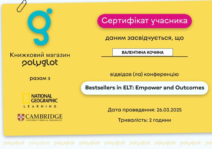 Науково-педагогічний склад кафедри мовної підготовки ХНУВС – завідувачка кафедри Олена СТАТІВКА, професор Олег ГОНЧАРУК, доцентки Валентина ПОЧУЄВА та Валентина КОЧИНА, старші викладачі Лариса САЗАНОВА та Артем БІЛОУСОВ – відвідали Міжнародну онлайн-конференцію «Bestsellers in ELT: Empower and Outcomes», організовану та проведену офіційними представниками компаній Polyglot, National Geographic Learning і Cambridge University Press and Assessment.