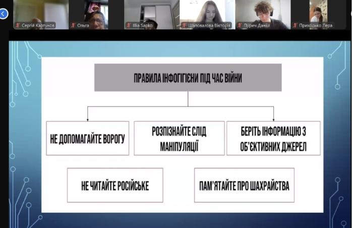 Під час заходів Олена МОХОРЄВА ознайомила школярів із поняттями «інформаційна гігієна», «інформаційне поле» та «інформаційно-психологічні операції». Разом із молоддю обговорили зміст і важливість профілактичних заходів щодо запобігання поширенню фейкових новин, а також необхідність стежити за інформаційною стрічкою винятково через офіційні джерела та ресурси органів місцевого самоврядування. Лекторка також надала учням корисні поради щодо подолання стресу та тривожності під час війни, зокрема внаслідок впливу негативної інформації.