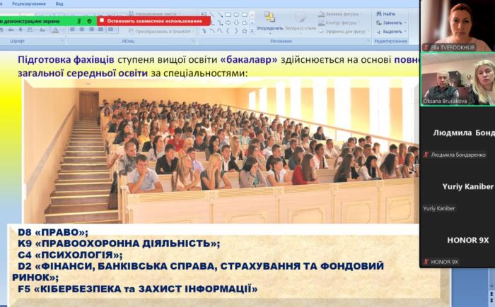 Директорка ННІ №5 Оксана БРУСАКОВА разом із заступниками та науково-педагогічними працівниками кафедр інституту провела зустріч з учнями випускних класів, які готуються до вступу до ХНУВС. До заходу також долучилися здобувачі першого (бакалаврського) рівня вищої освіти, які планують вступати на навчання до магістратури. Учасникам розповіли про умови та порядок вступу, про навчально-наукові інститути та спеціальності, за якими готують фахівців. Особливу увагу було приділено можливостям практичної підготовки та подальшого працевлаштування. Майбутні вступники отримали відповіді на чисельні запитання та поради щодо правил вступу.
