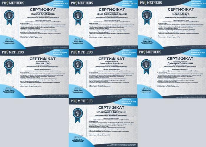 Під керівництвом кураторки курсанти пройшли онлайн-курс «Медіаграмотність: як не піддаватися маніпуляціям?» на платформі Prometheus. Навчання охоплювало п’ять ключових модулів: «Медіа грамотність в умовах інформаційної війни», «Фактчекінг в умовах інформаційної війни», «Інформаційно-психологічні операції (ІПСО) під час війни», «Журналістика під час війни: як оцінити якість медіа», «Інформаційний фронт: як медіа грамотно створювати та поширювати контент?».