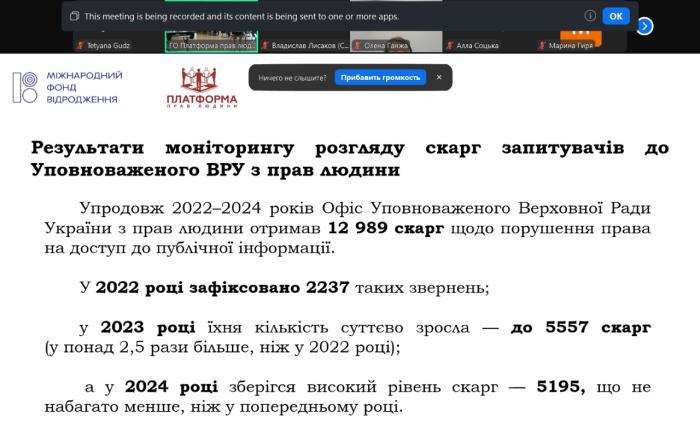 Учасників привітали виконавча директорка ГО «Платформа прав людини» Олександра СТЕПАНОВА, народний депутат України Микита ПОТУРАЄВ, Голова Касаційного адміністративного суду у складі Верховного Суду Михайло СМОКОВИЧ і представниця Уповноваженого Верховної Ради України з інформаційних прав Юлія ДЕРКАЧЕНКО. Під час заходу було представлено дані моніторингу судової практики щодо адміністративних справ, пов’язаних із порушенням права на доступ до публічної інформації, проаналізовано рішення щодо притягнення до адміністративної відповідальності за порушення законодавства в цій сфері, а також висвітлено результати розгляду скарг до Уповноваженого Верховної Ради України з прав людини та запитів, надісланих через онлайн-платформу «Доступ до правди». У заключній частині відбулося активне обговорення результатів дослідження за участю представників судової влади, офісу Омбудсмана, Ради Європи та громадських організацій.