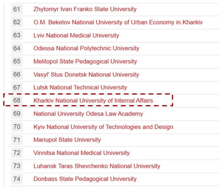 Харківський національний університет внутрішніх справ піднявся ще на 2 позиції та посів 68 місце серед 189 українських університетів і 5842 місце серед 14 000 університетів світу. Вже традиційно це найкращий результат серед закладів вищої освіти МВС України.