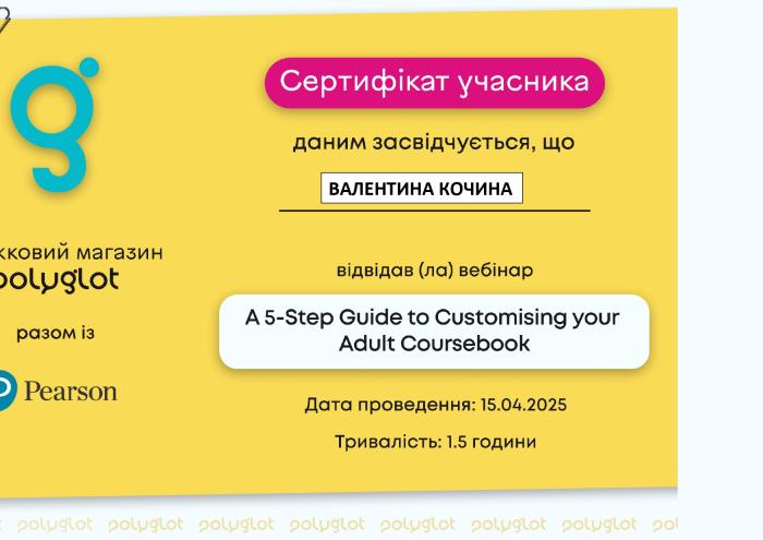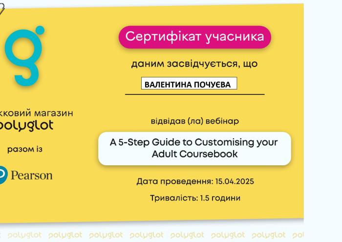 Науково-педагогічний склад кафедри мовної підготовки ХНУВС – завідувачка кафедри Олена СТАТІВКА, професор Олег ГОНЧАРУК, доцентки Валентина ПОЧУЄВА та Валентина КОЧИНА, старші викладачі Лариса САЗАНОВА та Артем БІЛОУСОВ – відвідали Міжнародний онлайн-вебінар «A 5-Step Guide to Customising your Adult Coursebook» від компанії Pearson. Викладачі отримали корисну інформацію про нові навчальні підручники з англійської мови для дорослих, матеріал яких може бути успішно використано під час проведення практичних занять із здобувачами освіти в межах дисципліни «Іноземна мова професійного спрямування».
