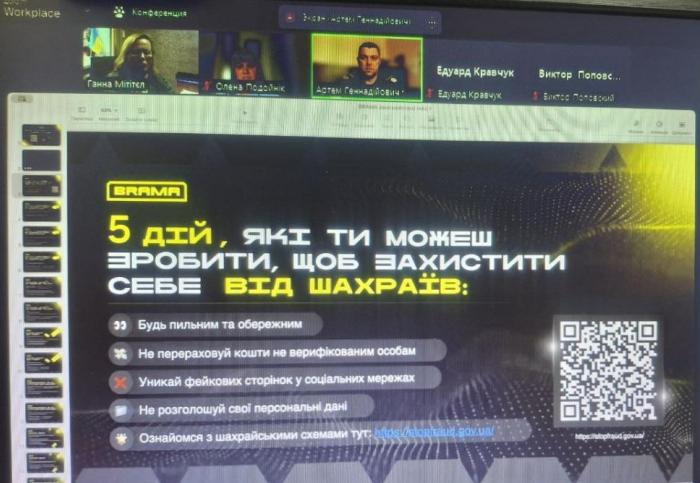 Під час інформаційно-просвітницької бесіди курсанти переглянули відеоролик «Захистись від шахраїв разом із нами!» та презентацію про основні види онлайн-шахрайства. Вони також ознайомилися із проєктом «BRAMA», створеним кіберполіцією задля боротьби з поширенням російської пропаганди в інтернеті.