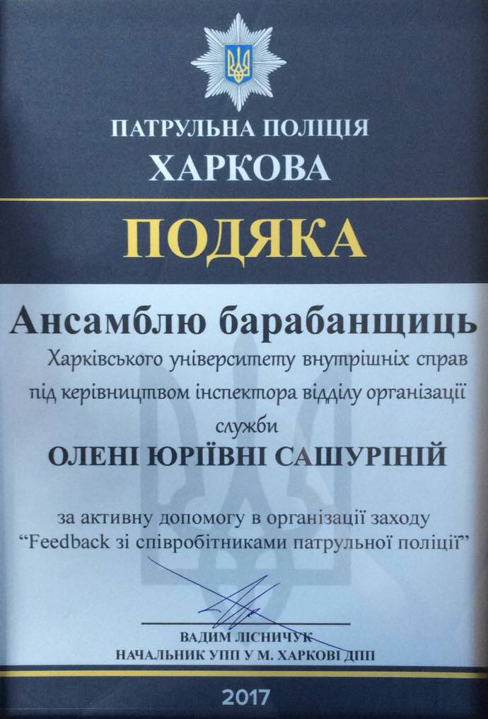 Ансамбль барабанщиць Харківського національного університету внутрішніх справ під керівництвом інспектора відділу організації служби Олени Сашуріної нагороджений Подякою Управління патрульної поліції у м. Харків за активну допомогу в організації заходу «Feedback зі співробітниками патрульної поліції».
