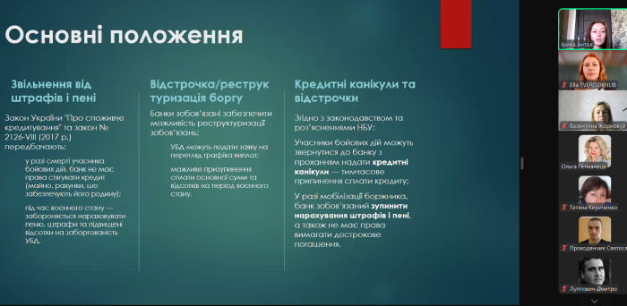 Семінар на тему «Пільги учасникам бойових дій щодо сплати податків і зборів та за кредитними зобов’язаннями» для консультантів відділення Юридичної клініки ННІ №5 ХНУВС провела кураторка відділення, старша викладачка кафедри правового забезпечення підприємницької діяльності та фінансової безпеки Ірина АНТОЛ.