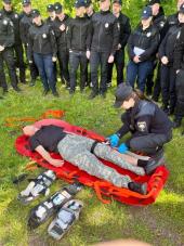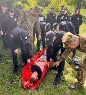 Курсанти ознайомилися з вмістом аптечки бійця-рятувальника, відпрацювали послідовність надання тактичної допомоги пораненому в зоні обстрілу та польових умовах, способи зупинки масивної кровотечі, а також порядок проведення евакуації поранених із застосуванням жорстких нош.