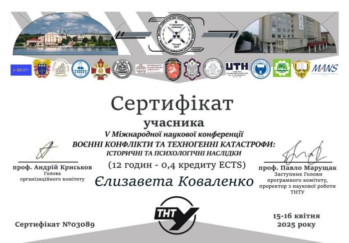 Професорка кафедри соціально-економічних дисциплін Олена ЛУК’ЯНИХІНА разом зі студенткою 1 курсу Єлизаветою Коваленко дистанційно долучилися до роботи IV Міжнародної науково-практичної конференції «Воєнні конфлікти та техногенні катастрофи: історичні та психологічні наслідки», організованої Тернопільським національним технічним університетом імені Івана Пулюя.