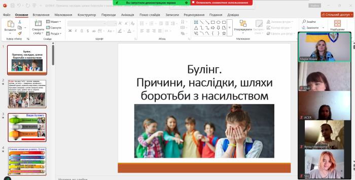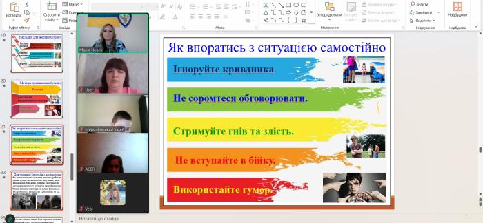 У Миропільському ліцеї відбулася змістовна та пізнавальна онлайн-лекція на тему «Протидія булінгу» для учнів 1-4-х і 5-8-х класів. Захід пройшов за участі викладачки кафедри спеціальних поліцейських дисциплін та базової загальновійськової підготовки Сумської філії ХНУВС Марії НОВИК.