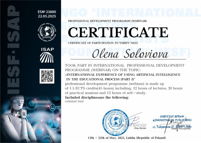 Доцентка кафедри кримінального процесу, криміналістики та експертології ННІ №5 ХНУВС, кандидатка юридичних наук, доцентка Олена СОЛОВЙОВА взяла участь у Міжнародному підвищенні кваліфікації (вебінарі) на тему: «Міжнародний досвід використання штучного інтелекту в освітньому процесі (частина i)». Організатори заходу – Інститут справ адміністрації публічної ISAP (м. Люблін, Республіка Польща) і Міжнародна фундація науковців та освітян – IESF. За результатами навчання отримано сертифікат, що засвідчує набуття компетентностей у сфері використання штучного інтелекту в освітньому процесі, впровадженню інноваційних підходів у навчальний процес та підвищенню якості підготовки фахівців в Україні. Учасники вебінару розширили знання про сучасні освітні технології, глибше усвідомили потенціал штучного інтелекту в трансформації освітнього середовища, а також отримали нові ідеї щодо модернізації освітнього процесу відповідно до провідних європейських і світових практик і стандартів.