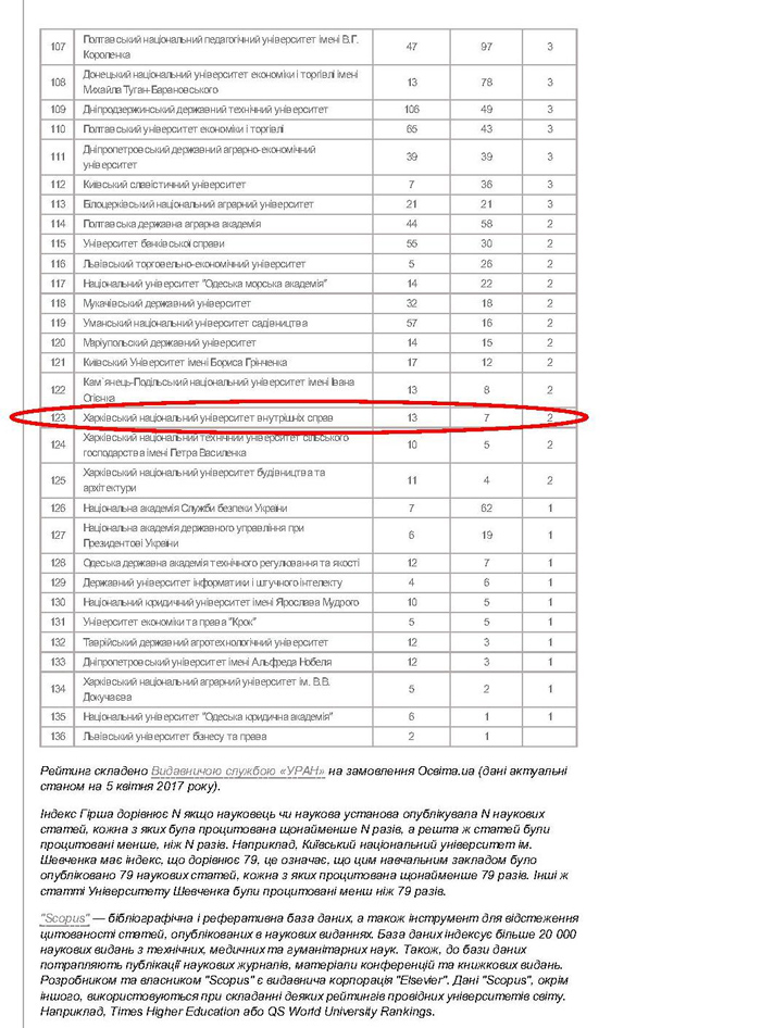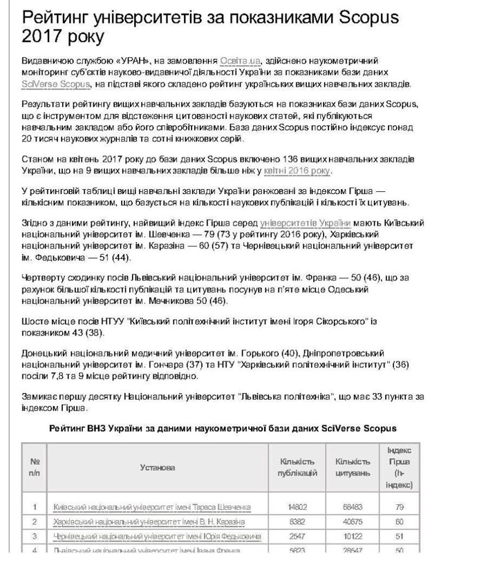 Станом на квітень 2017 року до бази даних Scopus включено 136 вищих навчальних закладів України. Це на 9 ВНЗ більше, ніж у квітні 2016 року. У рейтинговій таблиці вищі навчальні заклади України ранжовані за індексом Гірша – кількісним показником, що базується на кількості наукових публікацій і кількості їх цитувань.