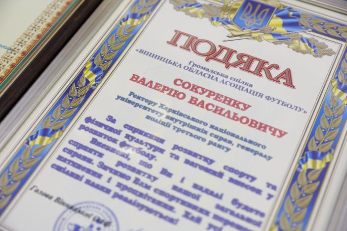 За вагомий внесок у розвиток футболу, відданість спорту та взаємопорозуміння ректор Валерій СОКУРЕНКО та проректор, голова правління ФСК «Універ-Динамо» Сергій БОРТНИК отримали Подяки від Вінницької обласної асоціації футболу, футбольний м’яч і спортивну форму для гравців команди.