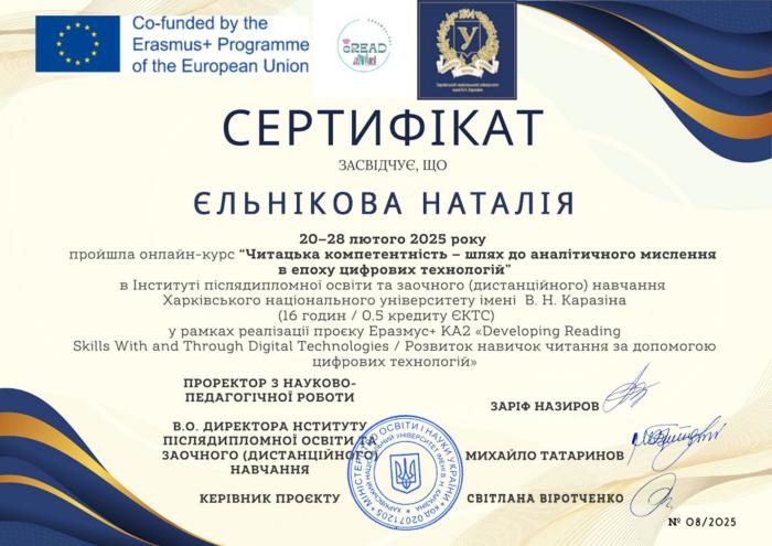 Старша викладачка кафедри гуманітарних дисциплін та українознавства, кандидатка філологічних наук Наталія ЄЛЬНІКОВА разом із доценткою цієї ж кафедри, кандидаткою філологічних наук, доценткою Наталією КОБИЛКО успішно завершили курс професійного розвитку «Читацька компетентність – шлях до аналітичного мислення в епоху цифрових технологій», розроблений у межах проєкту Developing Reading Skills With and Through Digital Technologies (eRead), що відбувся на базі Харківського національного університету імені В. Н. Каразіна.