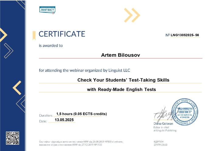 Старший викладач кафедри мовної підготовки ХНУВС Артем БІЛОУСОВ взяв участь у Міжнародному онлайн-вебінарі «Check Your Students’ Test-Taking Skills with Ready-Made English Tests» від компанії Linguist LLC. На вебінарі було розглянуто використання тестів у навчальному процесі викладання англійської мови: як виявляти труднощі (розподіл часу, читання інструкцій, вибір стратегії); як аналізувати результати не задля оцінки, а для розвитку навичок; як за типовими помилками зрозуміти, чи проблема в знаннях, чи в умінні працювати з тестами; які вправи й підходи допоможуть цілеспрямовано тренувати те, що справді потрібно здобувачам освіти. Отримана інформація може використовуватися для складання тестових завдань з дисципліни «Іноземна мова професійного спрямування».