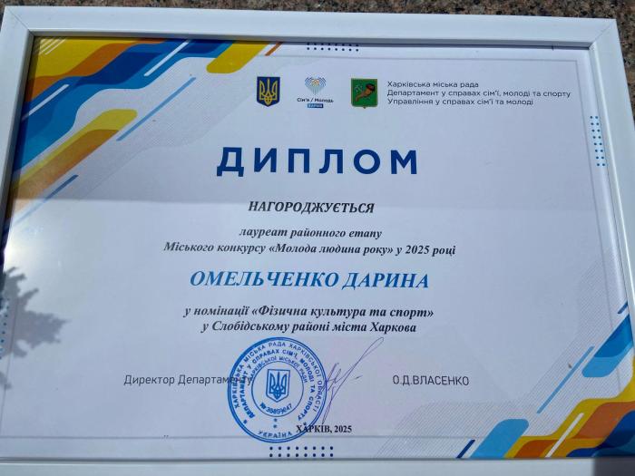 Здобувачка освіти 2 курсу ННІ №5 Дарина ОМЕЛЬЧЕНКО стала переможницею конкурсу «Молода людина року – 2025» у номінації «Фізична культура і спорт», який проводила адміністрація Слобідського району Харківської міської ради. Почесну грамоту та нагороду їй вручили голова адміністрації Вячеслав ІЛЛЄНКО та директор Департаменту у справах сім’ї, молоді та спорту Харківської міської ради Олександр ВЛАСЕНКО. Отримання почесної відзнаки та нагороди стало результатом високих спортивних досягнень і сумлінного навчання студентки.