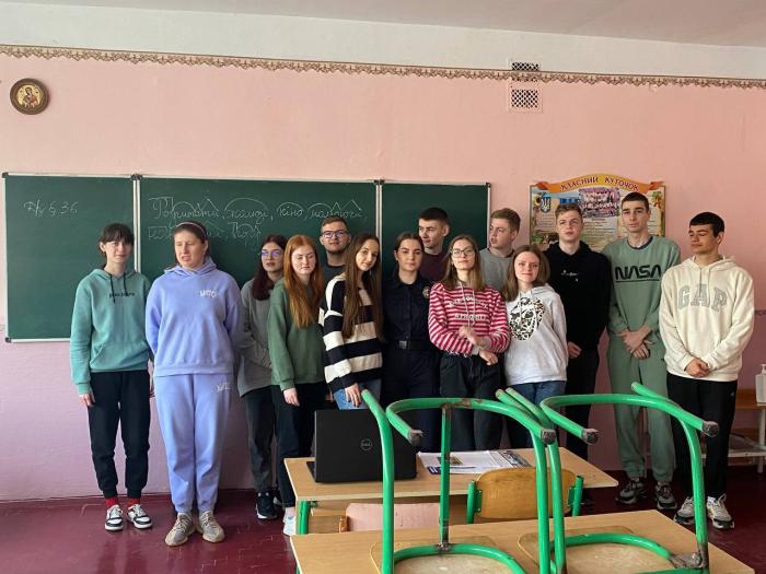 Курсантка ННІ №1 Ольга МЕЛЬНИЧУК провела профорієнтаційну зустріч з учнями випускних класів Тернопільської загальноосвітньої школи І-ІІІ ступенів №26 та розповіла про особливості вступу до ХНУВС, освітній процес, спеціальності, які можна опанувати, а також перспективи подальшого працевлаштування в органах системи МВС.