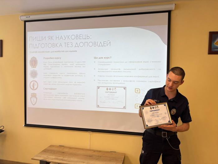Презентацію провів автор проєкту – курсант 2 курсу ННІ №4 Олександр МОЙКО. Він проаналізував зміст освітньої програми, окреслив ключові етапи її створення, розповів про труднощі, які виникали під час роботи, а також продемонстрував макет сертифіката, що отримають після успішного проходження навчання.