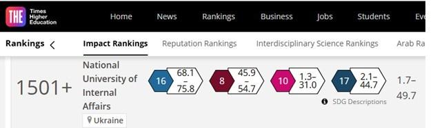 Харківський національний університет внутрішніх справ – єдиний серед закладів вищої освіти системи МВС України, який представлено в міжнародному рейтингу THE Impact Rankings 2025. Цього року він посів місце у групі 1501+.
